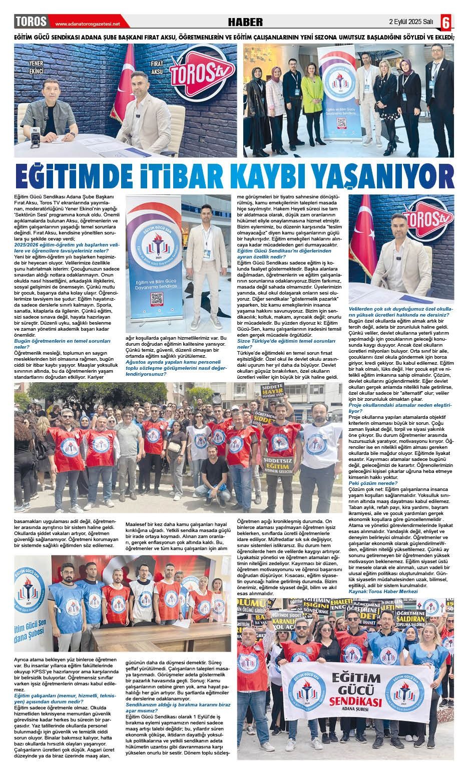 Eğitim Gücü Sendikası Adana Şube Başkanı Fırat Aksu, Toros TV ekranlarında yayımlanan, moderatörlüğünü Yener Ekinci’nin yaptığı ‘Sektörün Sesi’ programına konuk oldu. Önemli açıklamalarda bulunan Aksu, öğretmenlerin ve eğitim çalışanlarının yaşadığı temel sorunlara değindi. Fırat Aksu, kendisine yöneltilen sorulara şu şekilde cevap verdi;