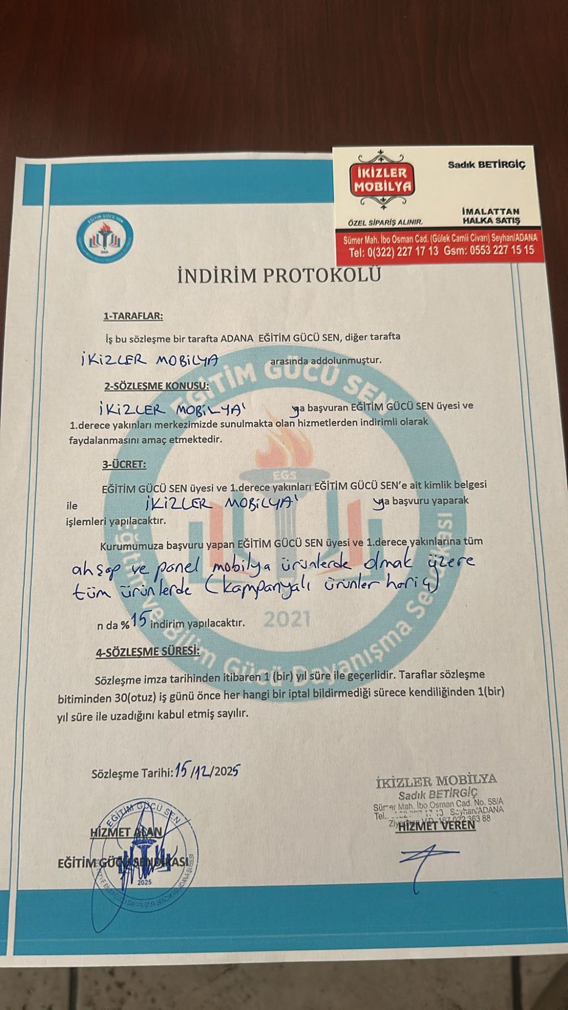 Sendika yönetimi tarafından yapılan görüşmeler neticesinde, 15 Aralık 2025 tarihinde İkizler Mobilya ile indirim protokolü imza altına alındı. Yapılan anlaşma gereği; Eğitim Gücü Sen üyeleri ve 1. derece yakınları, firma bünyesindeki alışverişlerinde liste fiyatı üzerinden indirim hakkına sahip olacak.